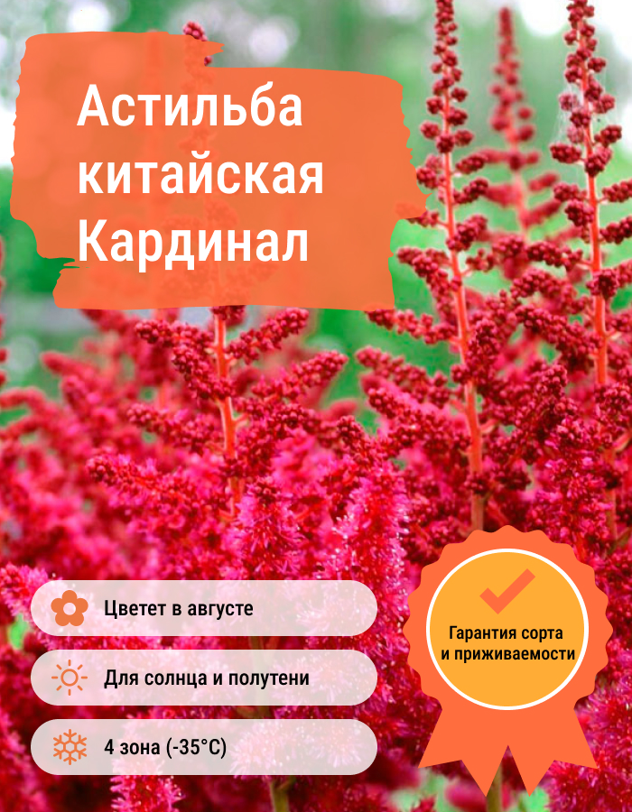 Саженцы Астильбы китайской Сardinal (Astilbe chinensis) достигают в высоту 80 сантиметров. Отличается своей морозостойкостью и влаголюбивостью. Предпочитает хорошо дренированную увлажненную почву вблизи водоемов. В диаметре разрастается до 50 сантиметров. На одном месте может расти около 20 лет. Сорт Кардинал цветет с июля по август мелкими цветками, которые собраны в метельчатые соцветия удлиненной формы. Соцветия пушистые, высокие яркого, насыщенного пурпурного цвета. Часто применяется для оформления альпинария, каменистой горки или декора водоема на участке.