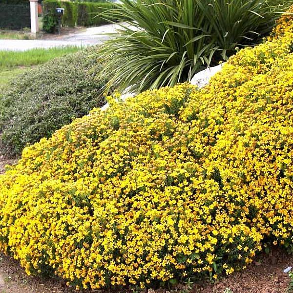 Рассада дрока Роял Голд (Royal Gold) вырастает карликовым кустиком около 50 см в высоту с пышной, ветвистой кроной. Листики простые, тройчатые, среднего размера и зеленого окраса. Цветет небольшими, желто-золотистыми цветочками, которые обильно и густо покрывают ветви. Достоинства дрока Роял Голд: