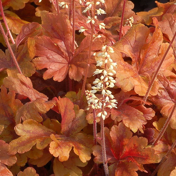 Рассада гейхереллы Баттеред Рам (Buttered rum) наполнит сад удивительными резными листьями, окрашенными оранжевыми и медными тонами, которые осенью меняются на бордово-багряные. Летом кусты особенно эффектно выглядят благодаря расцветающим белым цветочкам. Этот компактный сорт применяется для украшения клумб, альпийских горок и миксбордеров.