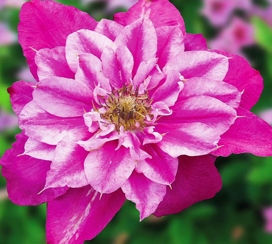 Саженцы клематиса гибридного Май Дарлинг (My darling) отдают предпочтение солнечным, хорошо освещенным, но не жарким местам. Почва должна быть рыхлой, богатой органическими и минеральными питательными веществами, со слабокислой или нейтральной реакцией среды. Цветет клематис гибридный Май Дарлинг (My darling) обильно в июне-июле, повторяет цветение в сентябре. Цветки махровые и полумахровые, диаметром до 23 см, пурпурно-розовые с розовой полосой и неровным белым окрасом. Длина побегов клематиса гибридного Май Дарлинг (My darling) колеблется в пределах 150-200 см, что позволяет выращивать его в контейнере и использовать для декорирования террас, балконов и лоджий. Подходит для выращивания на отдельно стоящей шпалере или в композиции на клумбе.