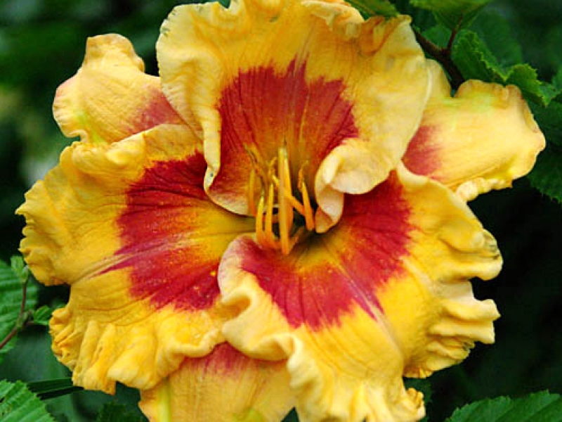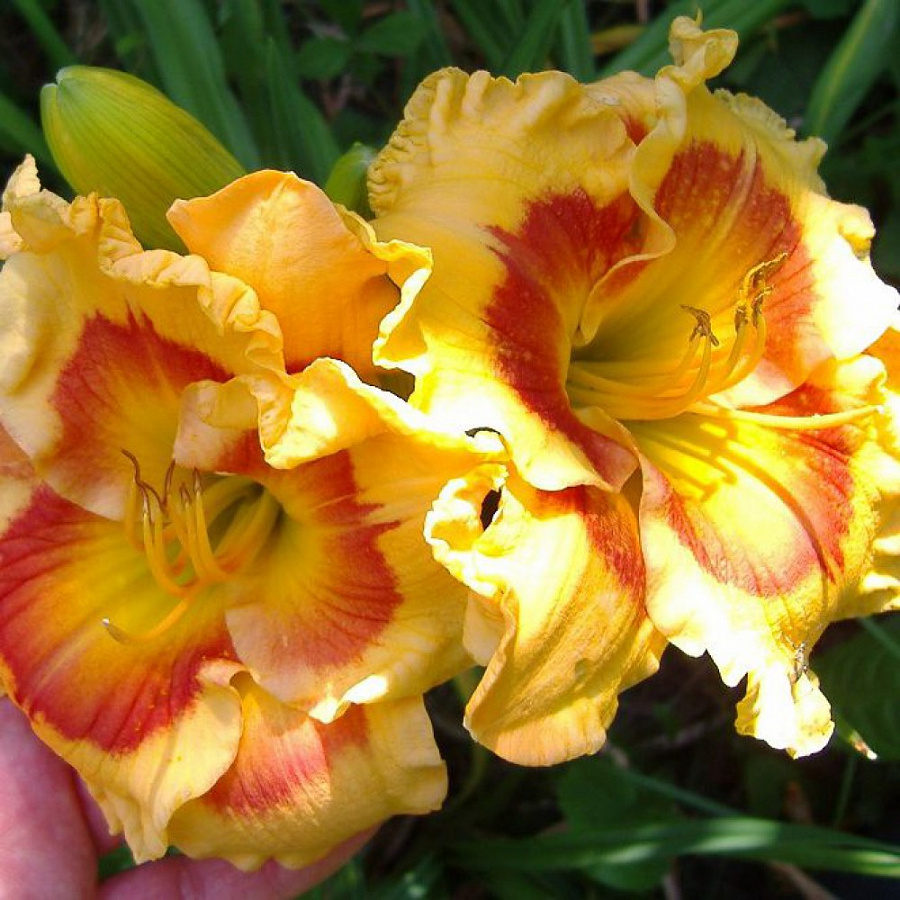 Саженцы и рассада Лилейника гибридного Икс Фактор (Hemerocallis) подойдут всем, кто хочет ежегодно наблюдать цветение одного из наиболее продуктивных сортов. Цветы у него яркие, в теплый тонах. Лепестки горчично-желтые, с лилово-красной каймой вокруг сердцевины. Они легкие и гофрированные, при этом прочно держатся и долго не осыпаются (до 6 дней).