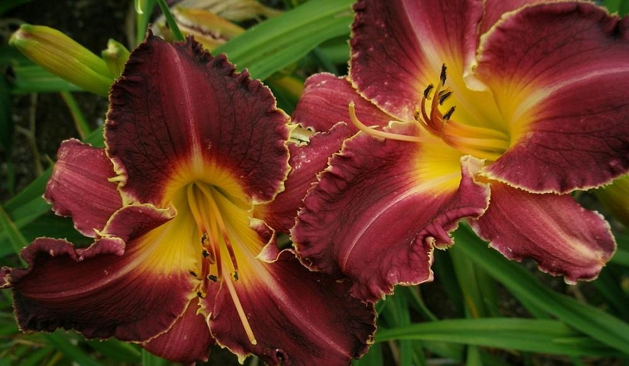 Бутоны лилейника Туз темно-вишневые с ярким желтым горлышком, из которого исходят радиальные лучи того оттенка. Верхние лепестки с аккуратной гофрировкой по всему краю придают цветку особое изящество.