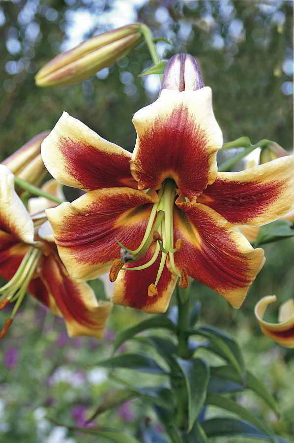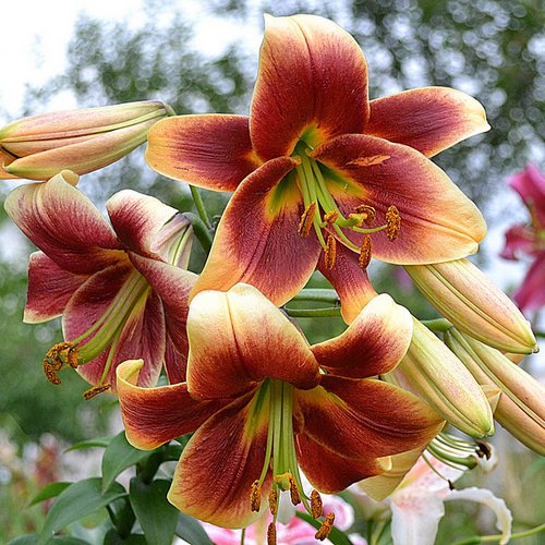 Луковицы лилии ОТ-гибрид Дебби (Lilium OT-hybrid Debby) – для яркого и контрастного сада. Они смогут освежить клумбы и хорошо приживутся на плодородных дренированных почвах. Многолетник вырастает от 90 до 150 см в высоту, причем рост набирает с годами. Цветки начинают раскрываться в середине лета и достигают 16-18 см в диаметре. Окраска лепестков очень яркая, контрастная. Едва заметная зеленая сердцевина переходит в темный красно-оранжевый крупный мазок на каждом лепестке. От середины до кончиков лепестки абрикосово-желтые со слегка загнутыми кончиками. Пыльники кирпично-красные на длинных зеленых ножках.