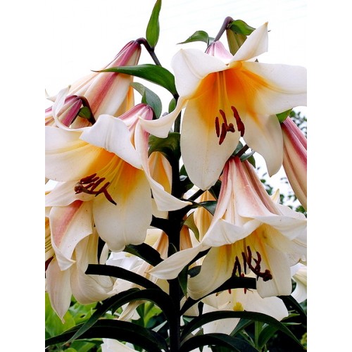 Лилия от-гибрид хай ти - это великолепное растение с нежно-лососевыми цветками и темной желтой серединой, которые подкручены вниз, создавая уникальный и изысканный вид. Этот сорт лилии отличается высокой морозостойкостью и прекрасно подходит для посадки как на газоне, так и в групповых посадках. Стебли достигают высоты до 120 см, а размер цветка составляет 25 см, что делает его по-настоящему величественным и элегантным растением.