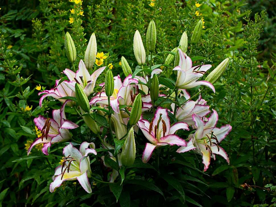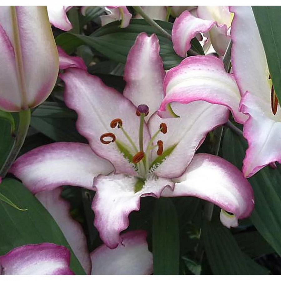 Луковицы лилии восточной Хотлайн (Lilium oriental Hotline) — один из ранних сортов. Период цветения начинается уже в июле и длится до конца лета. Растение выглядит очень эффектным: на длинных стеблях (до 120 см) распускаются крупные цветы, до 25 см в диаметре каждый. Лепестки белые, с контрастным лиловым кантом и яркими красными пыльниками. Цветы сочетаются с любыми композициями и ставят правильные акценты в ярких букетах. Лилия Хотлайн — один из самых морозостойких сортов. Она выдерживает заморозки до –40 градусов, при этом летом отлично растет под открытым солнцем. Если периодически подкармливать ее минеральными удобрениями, ее не нужно будет пересаживать в течение 3–5 лет.
