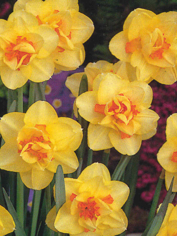 Луковицы нарцисса Ascot могут с успехом расти не только на солнечных открытых места, но и в полутени. В полную тень их сажать не стоит, поскольку тогда цветок будет очень мелкий и потеряет свои декоративные качества. Почва для луковиц нарцисса Ascot подходит любая, но хорошо дренированная. Крупные махровые светло-желтые цветы с тремя рядами лепестков раскрываются в начале апреля. Период цветения длится до середины мая. Желтые лепестки перемешаны с ярко-оранжевыми, гофрированными некрупными лепесточками коронки. Смотрится такой цветок очень нежно, будто стая бабочек.