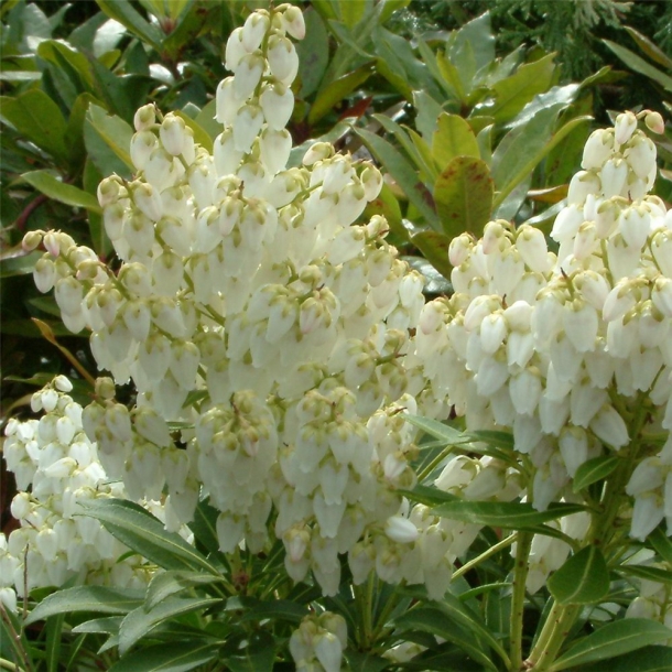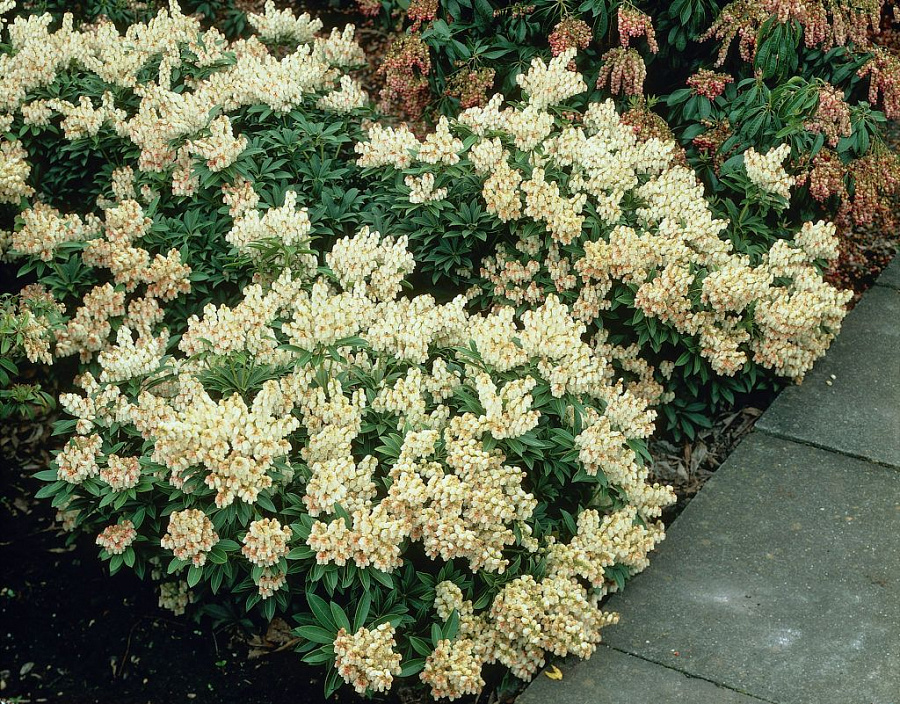 Глянцевые листики красиво отражают цвет. В сезон кустарник покрывается белоснежными цветами, и украшают сад до конца апреля. Затем на ветках появляются тёмные ягоды. Этот вид пиериса имеет плоские корни, которые располагаются близко к поверхности. Чтобы кустарник хорошо перенёс зиму, следуют мульчировать землю листвой.