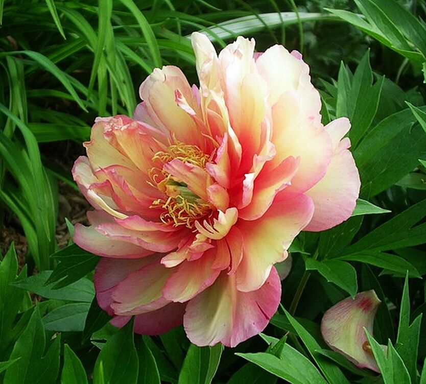 Рассада пиона ИТО Джулия Роуз (Julia Rose): сорт с воздушными цветами - удивительное сочетание утонченности и выносливости. Оттенки полумахровых соцветий меняются от лимонного до алого. На лепестках как будто отражена игра всех малиновых и бледно-желтых оттенков. Блестящие темно-зеленые листья являются хорошим фоном для нежных цветов. Прочные побеги не нуждаются в подвязке. Могут образовываться семена. Особенности посадки пиона Джулия Роуз: