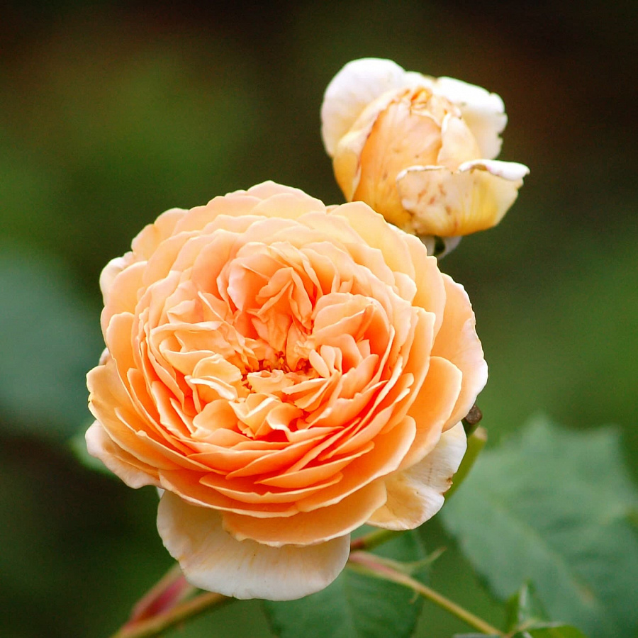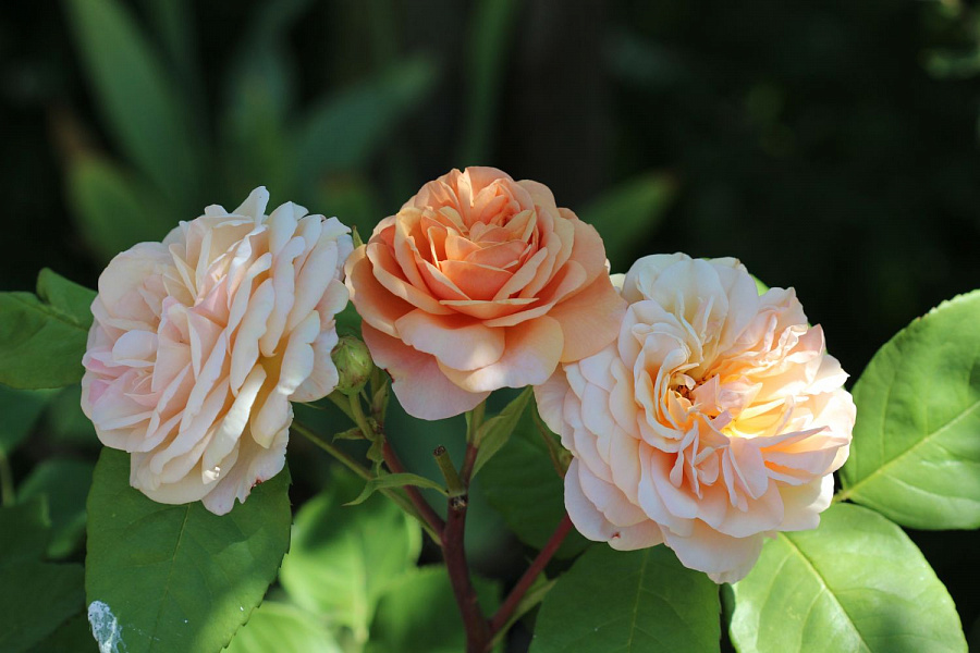 Цветы: крупные, нежного розового цвета с абрикосовым отливом. Множество лепестков собраны в чашевидные махровые соцветия.