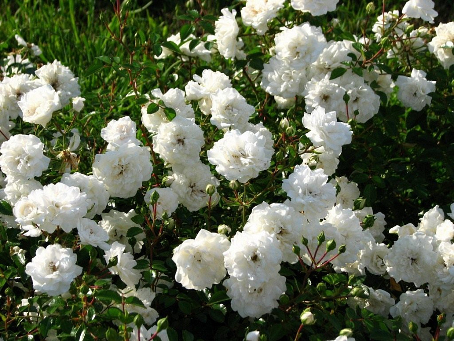 Саженцы розы почвопокровной Sea Foam идеально подходят для невысокой живой изгороди, использования как почвопокровного растения или создания каскада на склоне. Культура хорошо растет в полутени и на не очень богатых почвах. Высота куста 60-100 см, а ширина – 100 см. Цветы появляются на колючих, длинных, поникающих побегах в больших соцветиях. Бутоны небольшие, диаметром 5-6 см, бело-кремовые с небольшой розовинкой. Цветет роза почвопокровная Sea Foam с конца мая и до осенних заморозков.