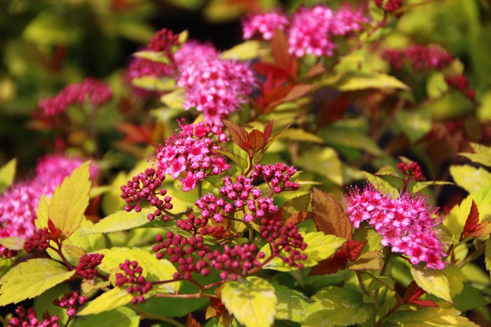Саженцы спиреи «Волшебный ковер» (Magic Carpet) в высоту достигает 50 сантиметров, а раскидывается в ширину на метр. Разрастается довольно быстро. В год она прибавляет в росте до 20 см. Крупномеры спиреи «Волшебный ковер» отличаются декоративными ланцетными листочками. Они меняют свой окрас на протяжении года – от оранжево-красных до ярко-желтых. Но их цвет всегда остается ярким и насыщенным. Зацветает кустарник в июне. До августа на нем красуются мелкие цветочки насыщено-розового цвета, собранные в соцветия. Высаживать саженцы спиреи «Волшебный ковер» рекомендовано в дренированную почву.