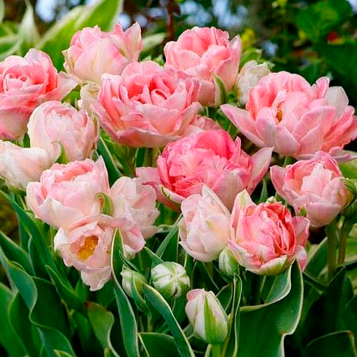 Тюльпан многоцветковый Аннелинда - это волшебное растение, которое поразит вас своей красотой и изяществом. Его махровые цветы в розово-белой окраске напоминают нежные облака на ясном весеннем небе. Высота этого тюльпана достигает до 40 см, что делает его идеальным для групповых и одиночных посадок в вашем саду или на клумбе. Листья тюльпана Аннелинда имеют вариегатный оттенок, что добавляет растению особый шарм и привлекательность.