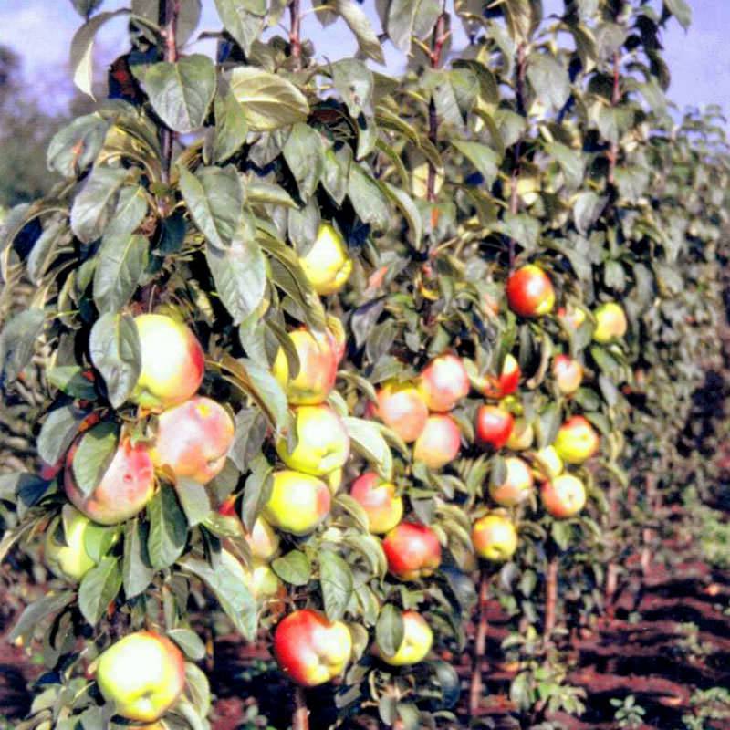 Саженцы яблони колоновидной Кумир относятся к позднеосенним сортам с красивыми полосатыми плодами красного цвета. Они среднего или большого размера от 150 до 250 г одна штука. По форме – округло-конические, глянцевые. На вкус яблоки кисло-сладкие с приятным запахом желтой мякоти.